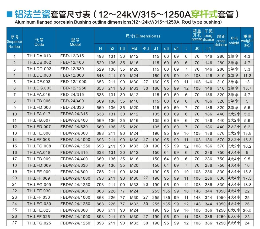 鋁法蘭瓷套管12~24kV/315~1250A穿桿式套管